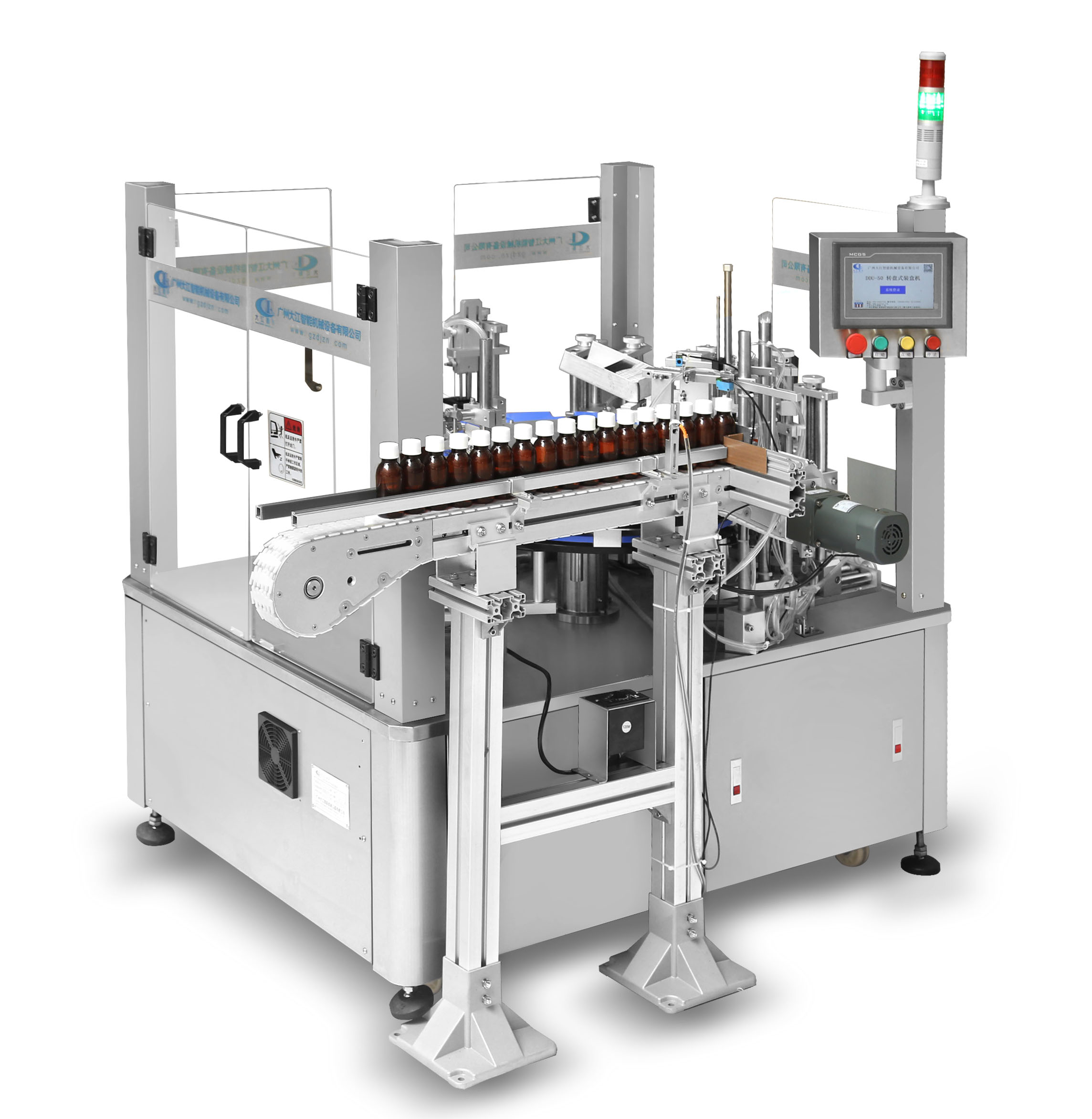 DDU-1603 立式圓瓶定位貼標(biāo)機 適用范圍:用途廣泛!主要適用于醫(yī)藥、日化、食品等行業(yè)的圓柱形包裝容器或小錐度的圓錐形包裝容器的單標(biāo)、雙標(biāo)自動定位貼標(biāo).該機拓展性強!可選配各類打印機完成在線實時打印,可單機使用,亦能連接生產(chǎn)線使用 主要性能結(jié)構(gòu)特點:1、中英文觸…